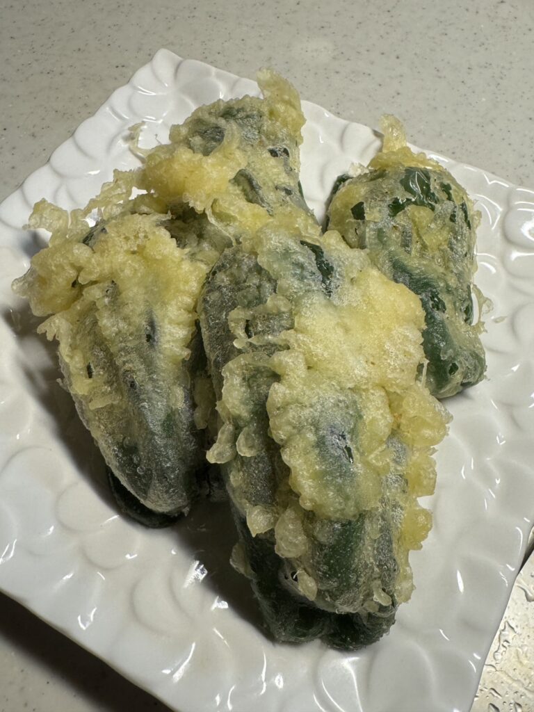 2. 天ぷら粉を冷水で溶き、ピーマンに衣をつける。